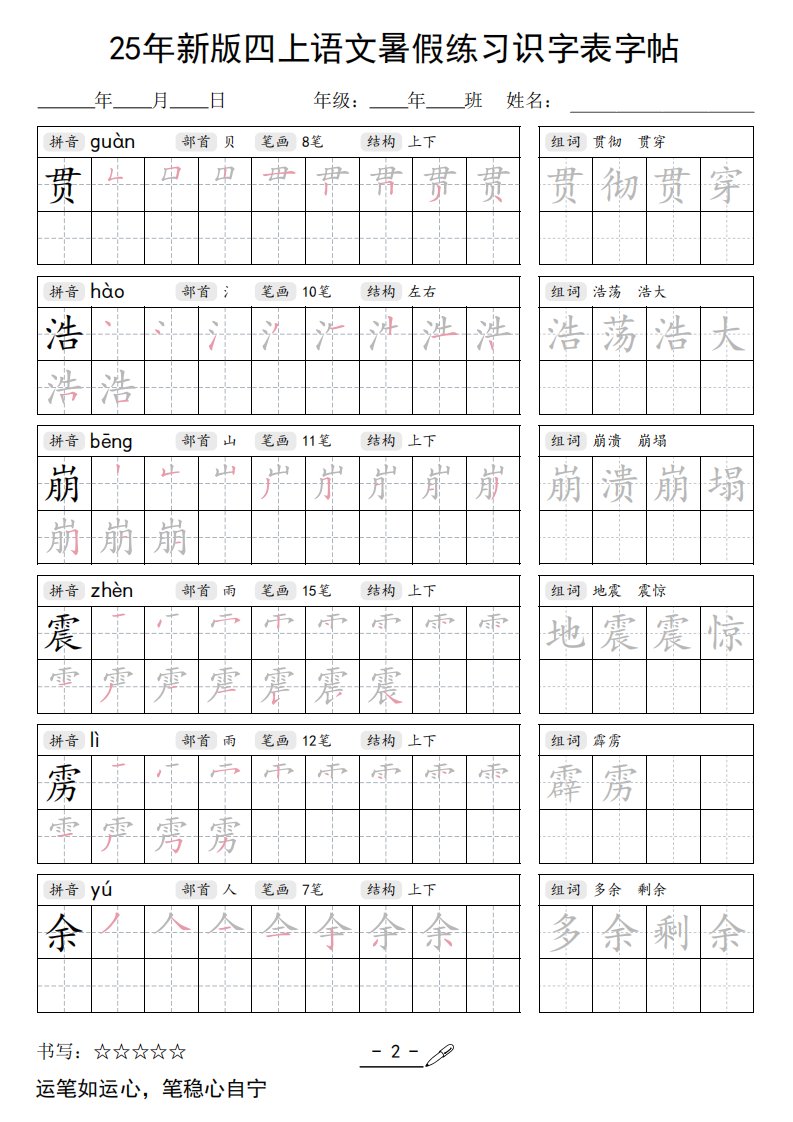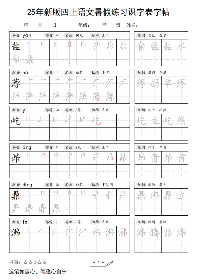 25年新版四上语文暑假练习识字表字帖46页_共46页