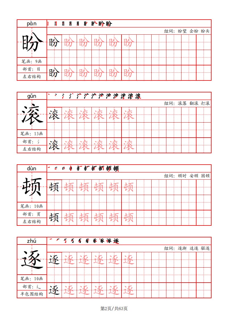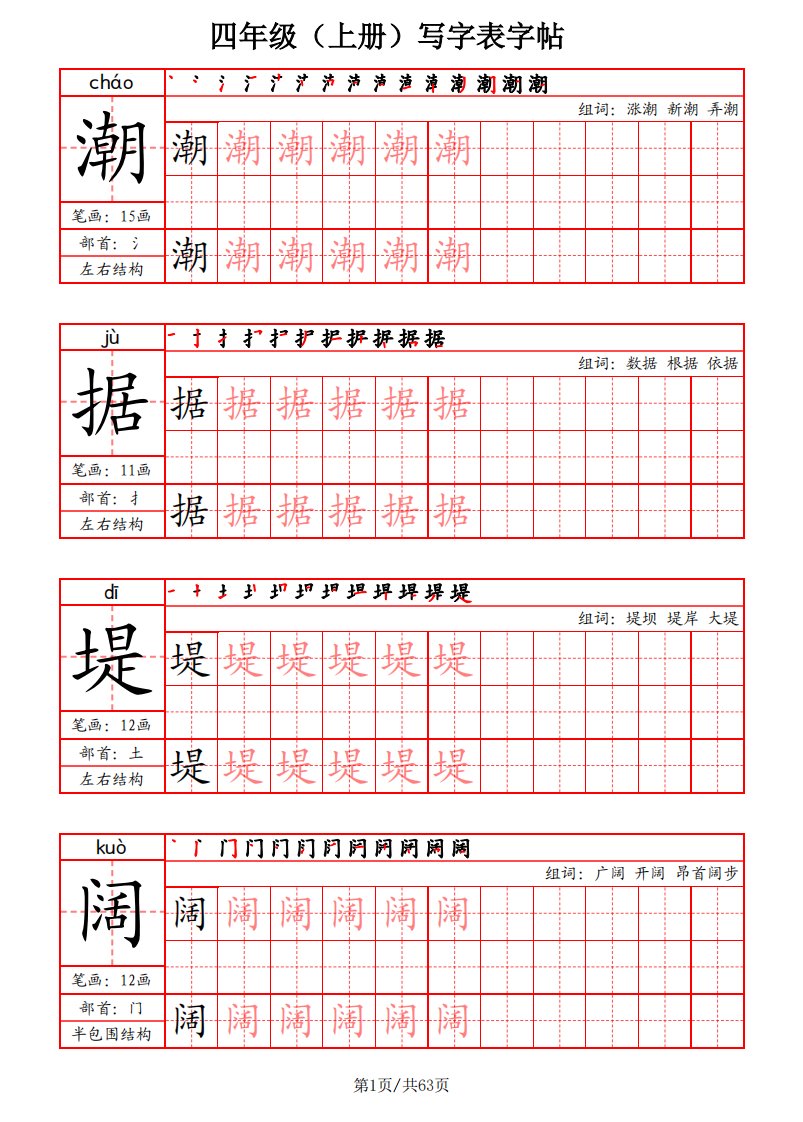 四上语文-写字表字帖(笔画+部首+笔顺+组词)_共63页