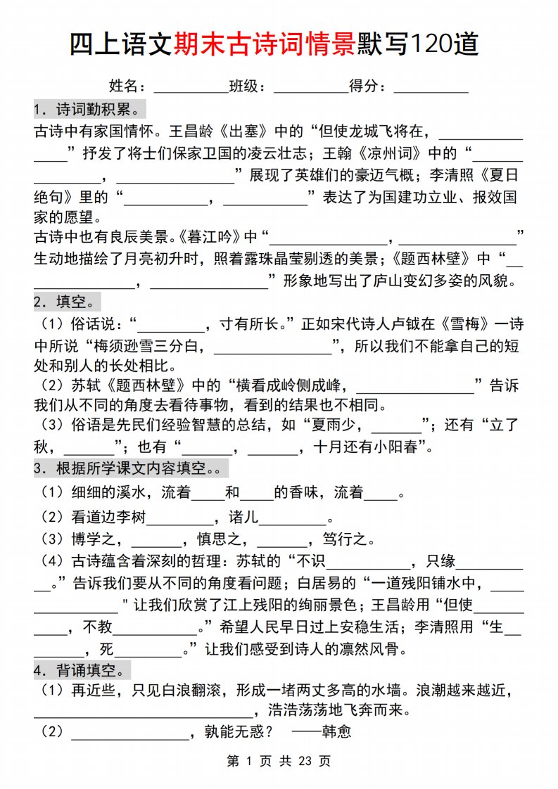 当前位置: 首页小学资源小学四年级正文 【期末古诗词情景默写120道】四上语文_共23页 小学四年级 1 周前 0 0 15 以上为部分内容预览,如需源文档请登录您的会员账号进行下载! 声明:本站所有文章,如无特殊说明或标注,均为本站原创发布。任何个人或组织,在未征得本站同意时,禁止复制、盗用、采集、发布本站内容到任何网站、书籍等各类媒体平台。如若本站内容侵犯了原著者的合法权益,可联系我们进行处理。 尚学资源永久会员 打赏 收藏 海报 链接