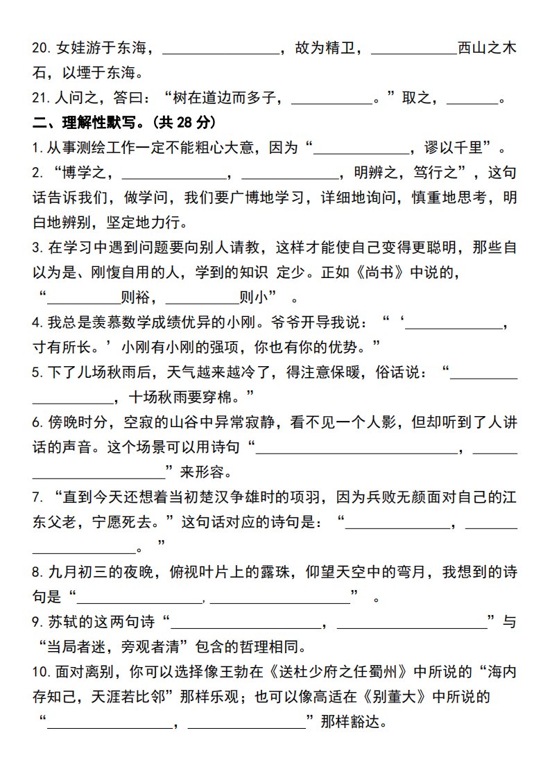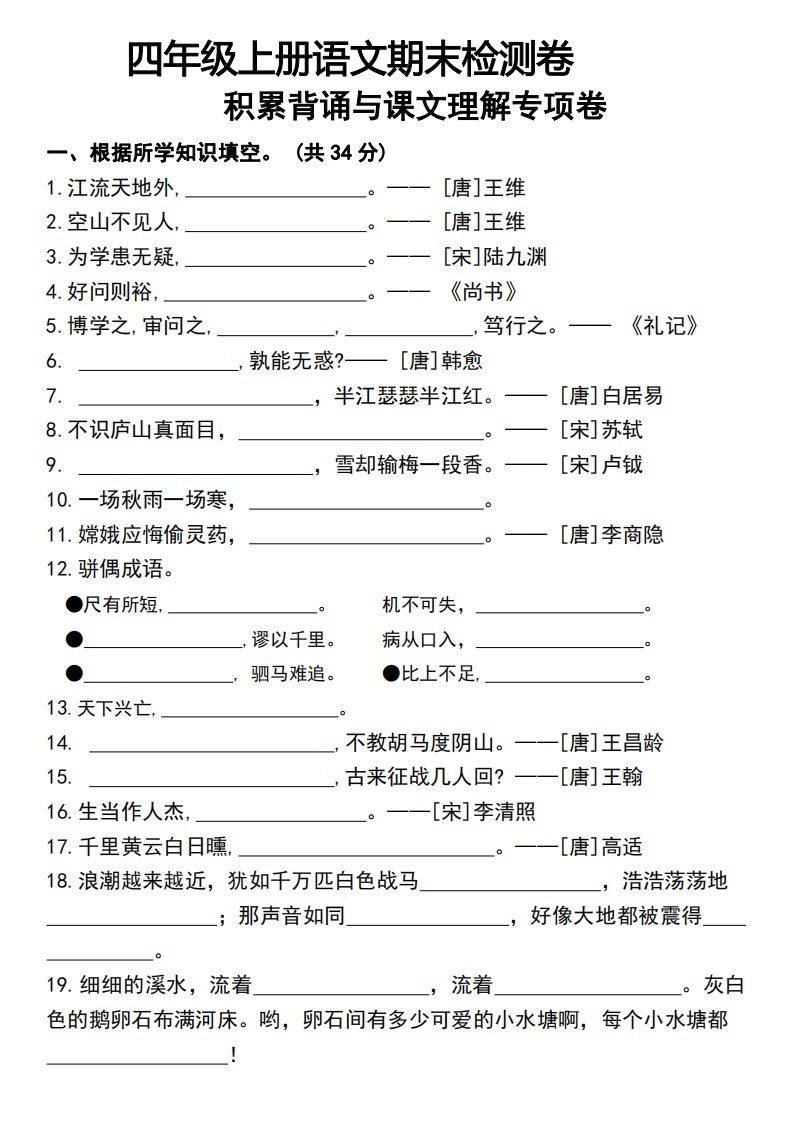 当前位置: 首页小学资源小学四年级正文 四年级上册语文期末检测卷积累背诵与课文理解专项卷_共10页 小学四年级 7 天前 0 0 5 以上为部分内容预览,如需源文档请登录您的会员账号进行下载! 声明:本站所有文章,如无特殊说明或标注,均为本站原创发布。任何个人或组织,在未征得本站同意时,禁止复制、盗用、采集、发布本站内容到任何网站、书籍等各类媒体平台。如若本站内容侵犯了原著者的合法权益,可联系我们进行处理。 尚学资源永久会员 打赏 收藏 海报 链接
