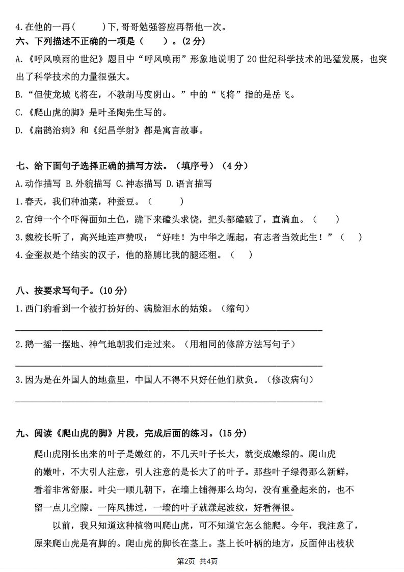 四年级上册语文期末综合测试卷_共8页