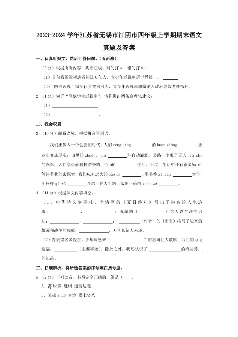 当前位置: 首页小学资源小学四年级正文 2023-2024学年江苏省无锡市江阴市四年级上学期期末语文真题及答案(Word版)_共14页 小学四年级 1 周前 0 0 10 以上为部分内容预览,如需源文档请登录您的会员账号进行下载! 声明:本站所有文章,如无特殊说明或标注,均为本站原创发布。任何个人或组织,在未征得本站同意时,禁止复制、盗用、采集、发布本站内容到任何网站、书籍等各类媒体平台。如若本站内容侵犯了原著者的合法权益,可联系我们进行处理。 尚学资源永久会员 打赏 收藏 海报 链接