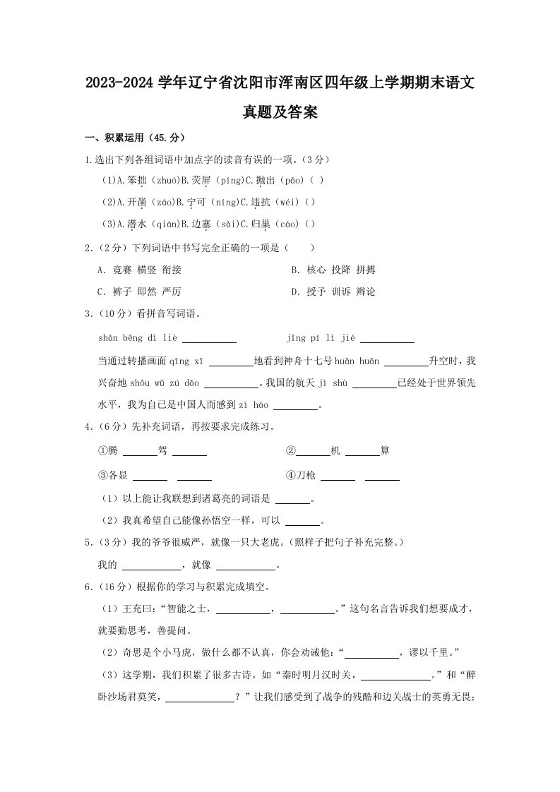 当前位置: 首页小学资源小学四年级正文 2023-2024学年辽宁省沈阳市浑南区四年级上学期期末语文真题及答案(Word版)_共5页 小学四年级 1 周前 0 0 5 以上为部分内容预览,如需源文档请登录您的会员账号进行下载! 声明:本站所有文章,如无特殊说明或标注,均为本站原创发布。任何个人或组织,在未征得本站同意时,禁止复制、盗用、采集、发布本站内容到任何网站、书籍等各类媒体平台。如若本站内容侵犯了原著者的合法权益,可联系我们进行处理。 尚学资源永久会员 打赏 收藏 海报 链接