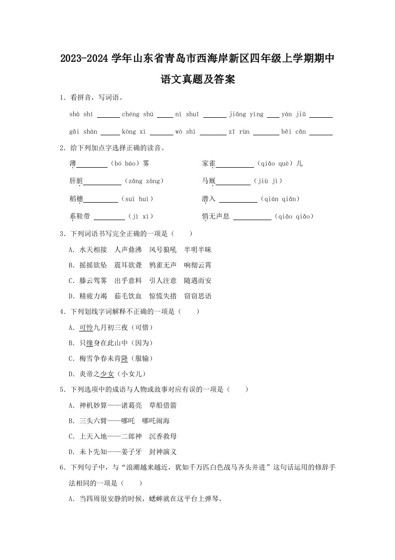 当前位置: 首页小学资源小学四年级正文 2023-2024学年山东省青岛市西海岸新区四年级上学期期中语文真题及答案(Word版)_共24页 小学四年级 1 周前 0 0 15 以上为部分内容预览,如需源文档请登录您的会员账号进行下载! 声明:本站所有文章,如无特殊说明或标注,均为本站原创发布。任何个人或组织,在未征得本站同意时,禁止复制、盗用、采集、发布本站内容到任何网站、书籍等各类媒体平台。如若本站内容侵犯了原著者的合法权益,可联系我们进行处理。 尚学资源永久会员 打赏 收藏 海报 链接