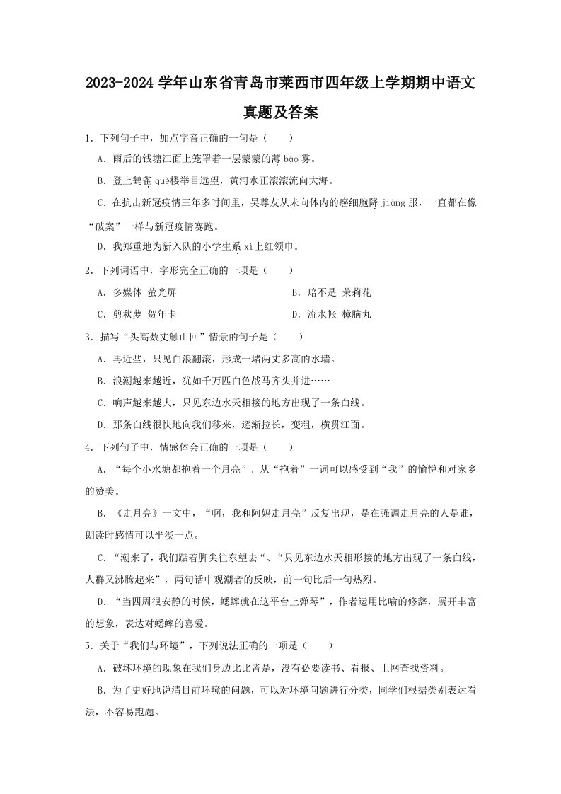 当前位置: 首页小学资源小学四年级正文 2023-2024学年山东省青岛市莱西市四年级上学期期中语文真题及答案(Word版)_共17页 小学四年级 1 周前 0 0 10 以上为部分内容预览,如需源文档请登录您的会员账号进行下载! 声明:本站所有文章,如无特殊说明或标注,均为本站原创发布。任何个人或组织,在未征得本站同意时,禁止复制、盗用、采集、发布本站内容到任何网站、书籍等各类媒体平台。如若本站内容侵犯了原著者的合法权益,可联系我们进行处理。 尚学资源永久会员 打赏 收藏 海报 链接