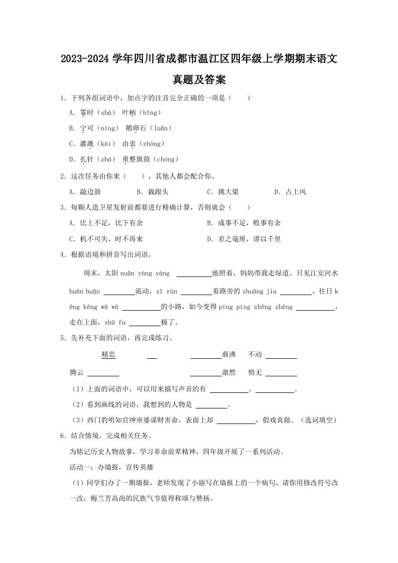 当前位置: 首页小学资源小学四年级正文 2023-2024学年四川省成都市温江区四年级上学期期末语文真题及答案(Word版)_共12页 小学四年级 1 周前 0 0 10 以上为部分内容预览,如需源文档请登录您的会员账号进行下载! 声明:本站所有文章,如无特殊说明或标注,均为本站原创发布。任何个人或组织,在未征得本站同意时,禁止复制、盗用、采集、发布本站内容到任何网站、书籍等各类媒体平台。如若本站内容侵犯了原著者的合法权益,可联系我们进行处理。 尚学资源永久会员 打赏 收藏 海报 链接