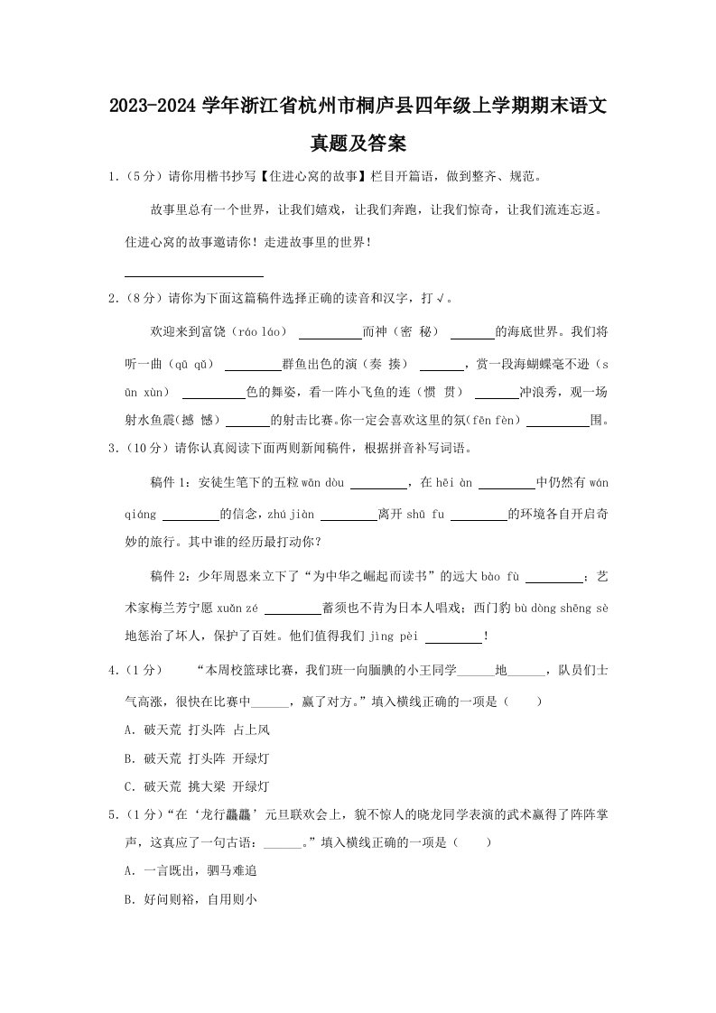 当前位置: 首页小学资源小学四年级正文 2023-2024学年浙江省杭州市桐庐县四年级上学期期末语文真题及答案(Word版)_共17页 小学四年级 1 周前 0 0 10 以上为部分内容预览,如需源文档请登录您的会员账号进行下载! 声明:本站所有文章,如无特殊说明或标注,均为本站原创发布。任何个人或组织,在未征得本站同意时,禁止复制、盗用、采集、发布本站内容到任何网站、书籍等各类媒体平台。如若本站内容侵犯了原著者的合法权益,可联系我们进行处理。 尚学资源永久会员 打赏 收藏 海报 链接