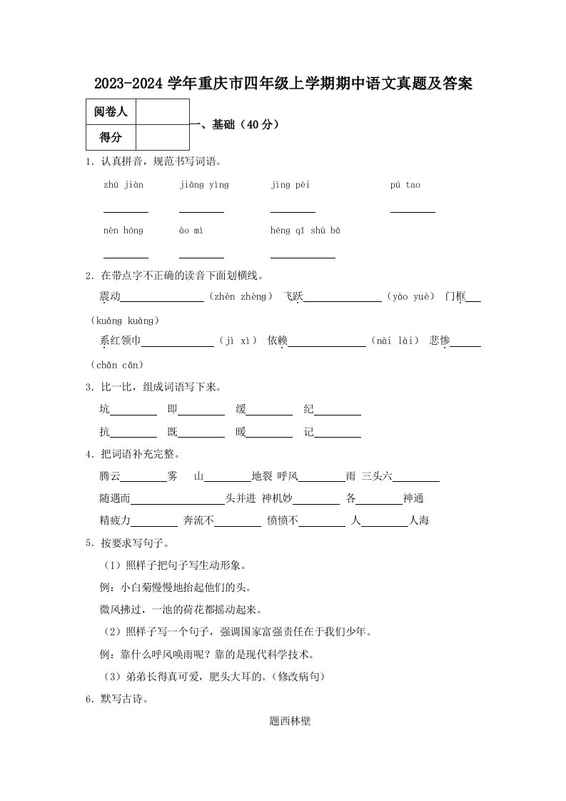 当前位置: 首页小学资源小学四年级正文 2023-2024学年重庆市四年级上学期期中语文真题及答案(Word版)_共10页 小学四年级 1 周前 0 0 5 以上为部分内容预览,如需源文档请登录您的会员账号进行下载! 声明:本站所有文章,如无特殊说明或标注,均为本站原创发布。任何个人或组织,在未征得本站同意时,禁止复制、盗用、采集、发布本站内容到任何网站、书籍等各类媒体平台。如若本站内容侵犯了原著者的合法权益,可联系我们进行处理。 尚学资源永久会员 打赏 收藏 海报 链接