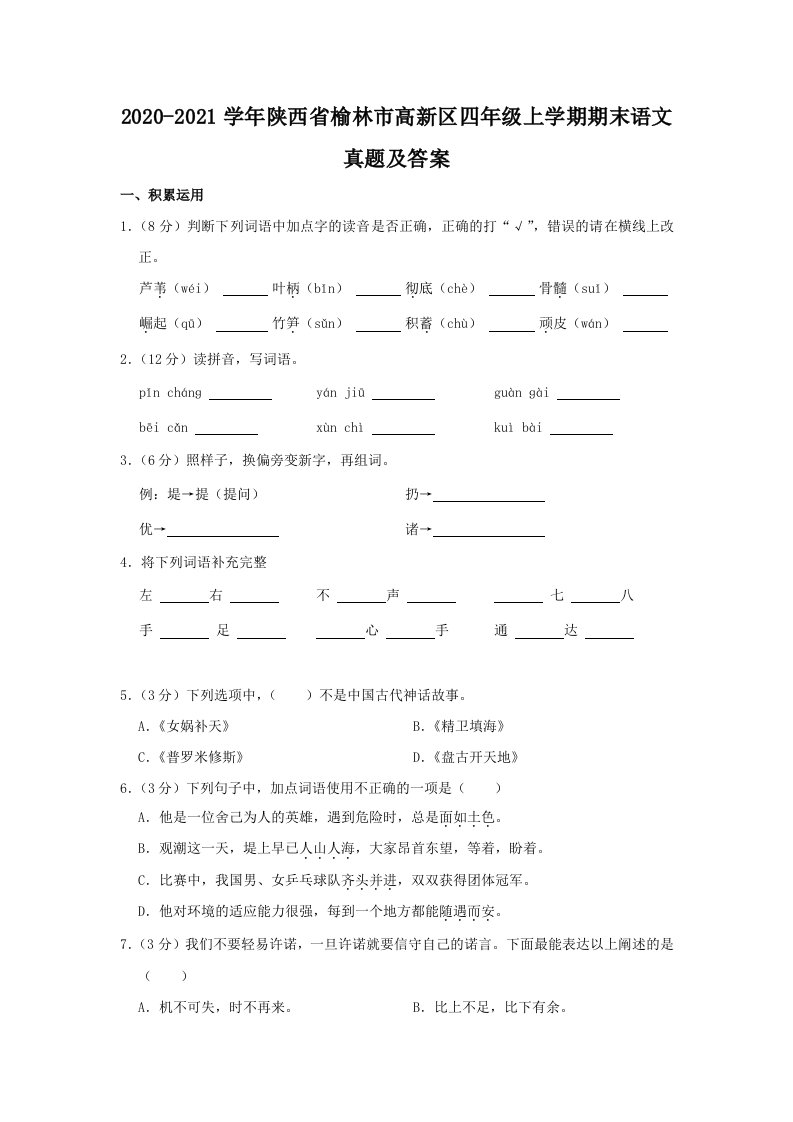 2020-2021学年陕西省榆林市高新区四年级上学期期末语文真题及答案(Word版)_共12页