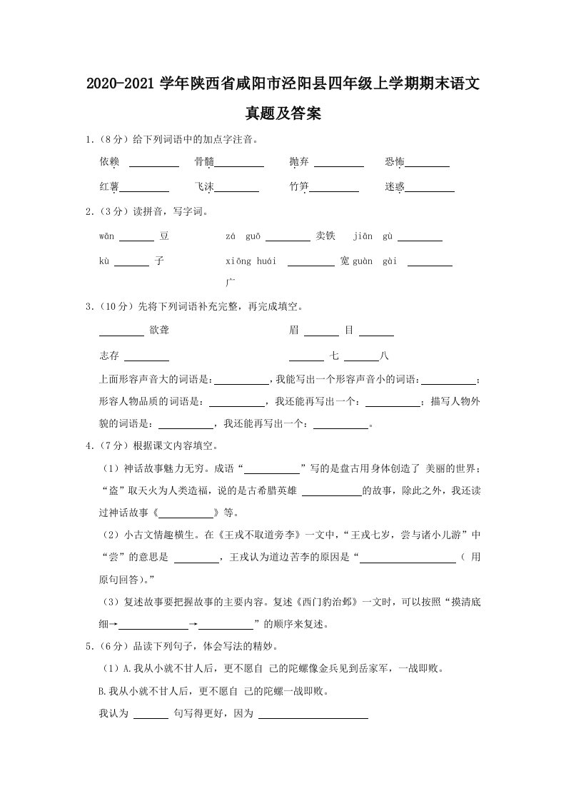 当前位置: 首页小学资源小学四年级正文 2020-2021学年陕西省咸阳市泾阳县四年级上学期期末语文真题及答案(Word版)_共12页 小学四年级 1 周前 0 0 10 以上为部分内容预览,如需源文档请登录您的会员账号进行下载! 声明:本站所有文章,如无特殊说明或标注,均为本站原创发布。任何个人或组织,在未征得本站同意时,禁止复制、盗用、采集、发布本站内容到任何网站、书籍等各类媒体平台。如若本站内容侵犯了原著者的合法权益,可联系我们进行处理。 尚学资源永久会员 打赏 收藏 海报 链接