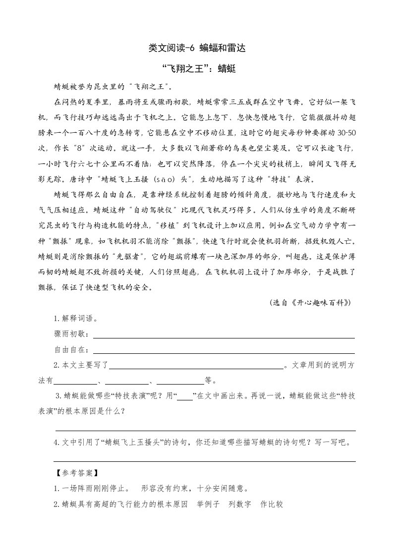 四年级语文上册类文阅读6蝙蝠和雷达_共3页