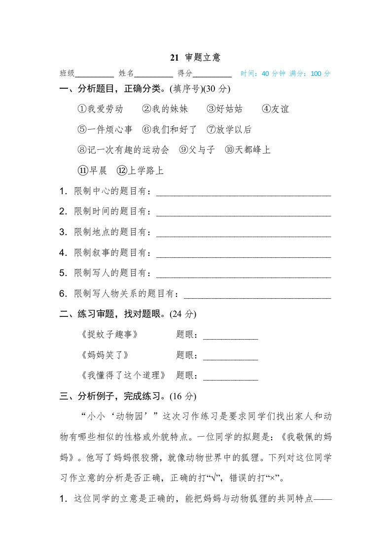 当前位置: 首页小学资源小学四年级正文 四年级语文上册21审题立意_共3页 小学四年级 1 周前 0 0 5 以上为部分内容预览,如需源文档请登录您的会员账号进行下载! 声明:本站所有文章,如无特殊说明或标注,均为本站原创发布。任何个人或组织,在未征得本站同意时,禁止复制、盗用、采集、发布本站内容到任何网站、书籍等各类媒体平台。如若本站内容侵犯了原著者的合法权益,可联系我们进行处理。 尚学资源永久会员 打赏 收藏 海报 链接