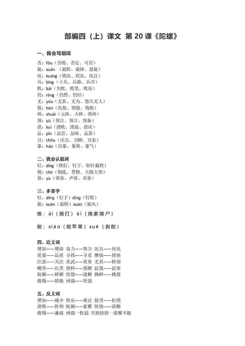 当前位置: 首页小学资源小学四年级正文 四年级语文上册20第20课《陀螺》_共5页 小学四年级 1 周前 0 0 5 以上为部分内容预览,如需源文档请登录您的会员账号进行下载! 声明:本站所有文章,如无特殊说明或标注,均为本站原创发布。任何个人或组织,在未征得本站同意时,禁止复制、盗用、采集、发布本站内容到任何网站、书籍等各类媒体平台。如若本站内容侵犯了原著者的合法权益,可联系我们进行处理。 尚学资源永久会员 打赏 收藏 海报 链接