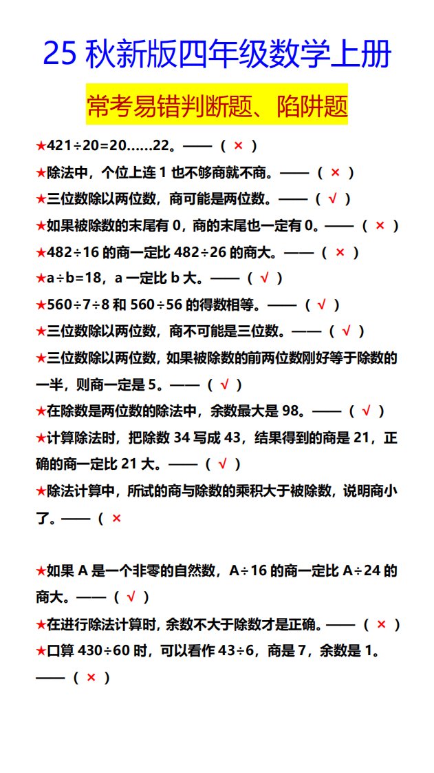 当前位置: 首页小学资源小学四年级正文 【2025秋新版】四年级数学上册常考易错判断题、陷阱题_共1页 小学四年级 1 周前 0 0 5 以上为部分内容预览,如需源文档请登录您的会员账号进行下载! 声明:本站所有文章,如无特殊说明或标注,均为本站原创发布。任何个人或组织,在未征得本站同意时,禁止复制、盗用、采集、发布本站内容到任何网站、书籍等各类媒体平台。如若本站内容侵犯了原著者的合法权益,可联系我们进行处理。 尚学资源永久会员 打赏 收藏 海报 链接