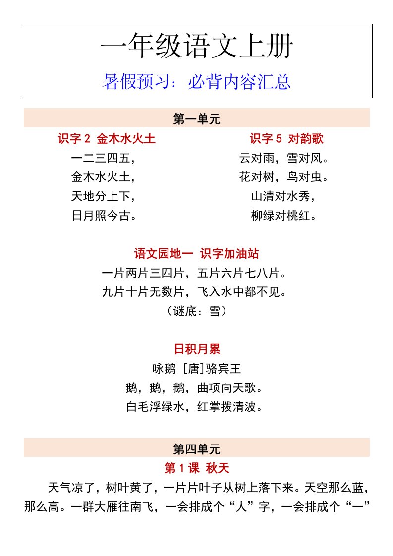 当前位置: 首页小学资源小学一年级正文 一年级语文上册暑假预习:必背内容汇总_共5页 小学一年级 2 周前 0 0 5 以上为部分内容预览,如需源文档请登录您的会员账号进行下载! 声明:本站所有文章,如无特殊说明或标注,均为本站原创发布。任何个人或组织,在未征得本站同意时,禁止复制、盗用、采集、发布本站内容到任何网站、书籍等各类媒体平台。如若本站内容侵犯了原著者的合法权益,可联系我们进行处理。 尚学资源永久会员 打赏 收藏 海报 链接