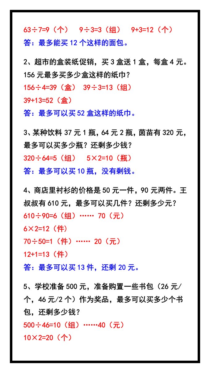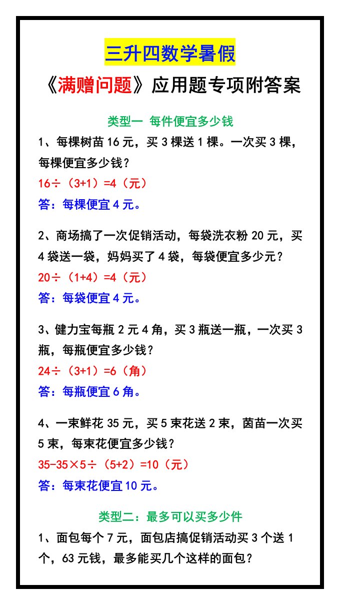 三升四数学暑假《满赠问题》应用题专项附答案-四上数学_共3页
