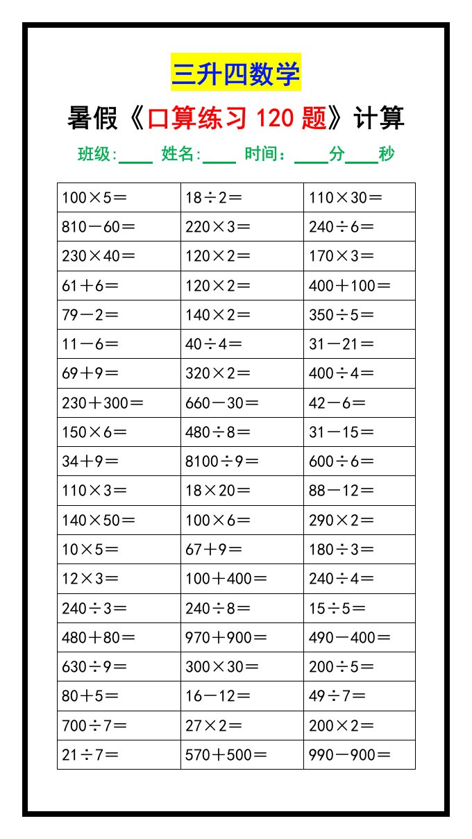 三升四数学暑假《口算练习120题》汇总-四上数学_共2页