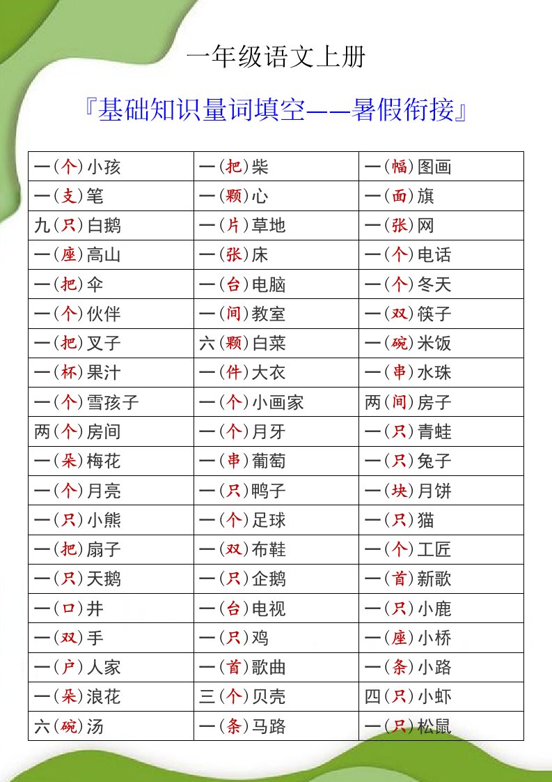 当前位置: 首页小学资源小学一年级正文 一年级语文上册基础知识量词填空暑假衔接_共4页 小学一年级 2 周前 0 0 5 以上为部分内容预览,如需源文档请登录您的会员账号进行下载! 声明:本站所有文章,如无特殊说明或标注,均为本站原创发布。任何个人或组织,在未征得本站同意时,禁止复制、盗用、采集、发布本站内容到任何网站、书籍等各类媒体平台。如若本站内容侵犯了原著者的合法权益,可联系我们进行处理。 尚学资源永久会员 打赏 收藏 海报 链接