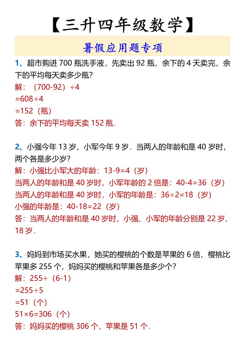 【三升四年级数学】暑假应用题专项-四上数学_共3页