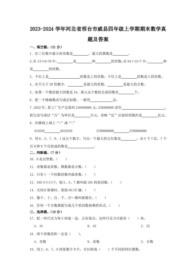 当前位置: 首页小学资源小学四年级正文 2023-2024学年河北省邢台市威县四年级上学期期末数学真题及答案(Word版)_共11页 小学四年级 1 周前 0 0 10 以上为部分内容预览,如需源文档请登录您的会员账号进行下载! 声明:本站所有文章,如无特殊说明或标注,均为本站原创发布。任何个人或组织,在未征得本站同意时,禁止复制、盗用、采集、发布本站内容到任何网站、书籍等各类媒体平台。如若本站内容侵犯了原著者的合法权益,可联系我们进行处理。 尚学资源永久会员 打赏 收藏 海报 链接