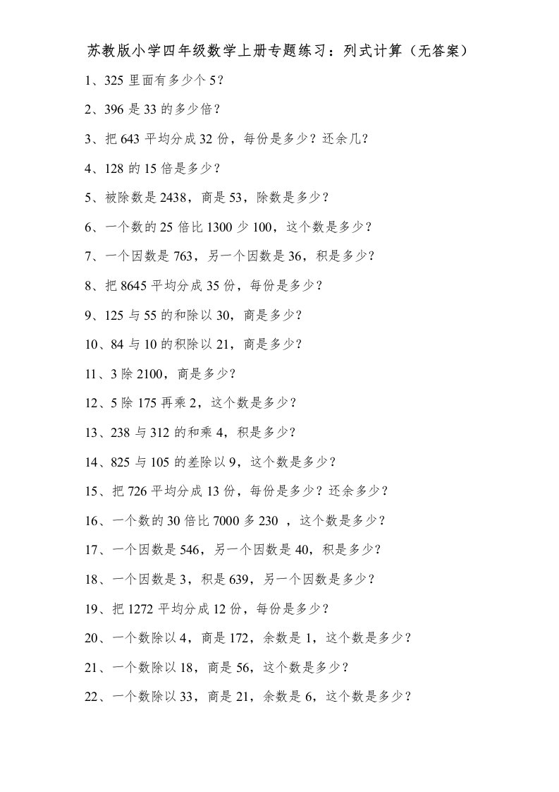 四年级数学上册专题练习:列式计算(无答案)(苏教版)_共3页