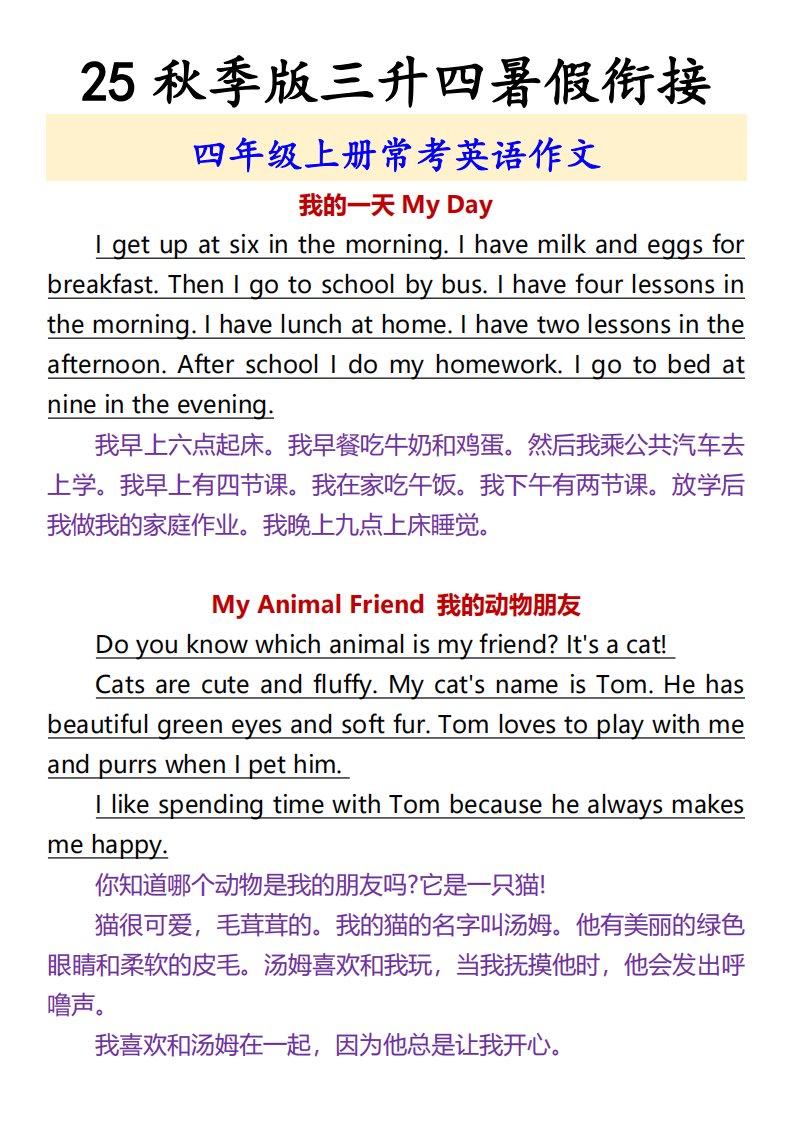 当前位置: 首页小学资源小学四年级正文 【2025秋新版】四年级上册常考英语作文_共4页 小学四年级 1 周前 0 0 5 以上为部分内容预览,如需源文档请登录您的会员账号进行下载! 声明:本站所有文章,如无特殊说明或标注,均为本站原创发布。任何个人或组织,在未征得本站同意时,禁止复制、盗用、采集、发布本站内容到任何网站、书籍等各类媒体平台。如若本站内容侵犯了原著者的合法权益,可联系我们进行处理。 尚学资源永久会员 打赏 收藏 海报 链接