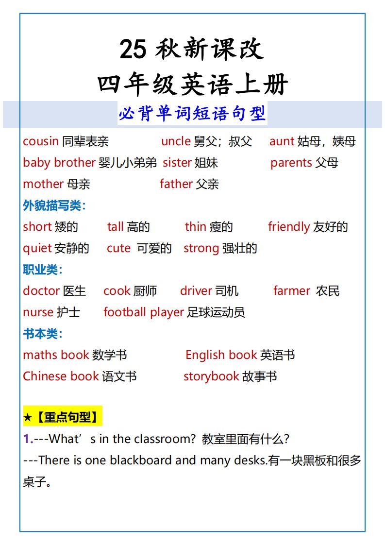 当前位置: 首页小学资源小学四年级正文 【2025秋新版】四年级英语上册必背单词短语句型_共5页 小学四年级 1 周前 0 0 5 以上为部分内容预览,如需源文档请登录您的会员账号进行下载! 声明:本站所有文章,如无特殊说明或标注,均为本站原创发布。任何个人或组织,在未征得本站同意时,禁止复制、盗用、采集、发布本站内容到任何网站、书籍等各类媒体平台。如若本站内容侵犯了原著者的合法权益,可联系我们进行处理。 尚学资源永久会员 打赏 收藏 海报 链接