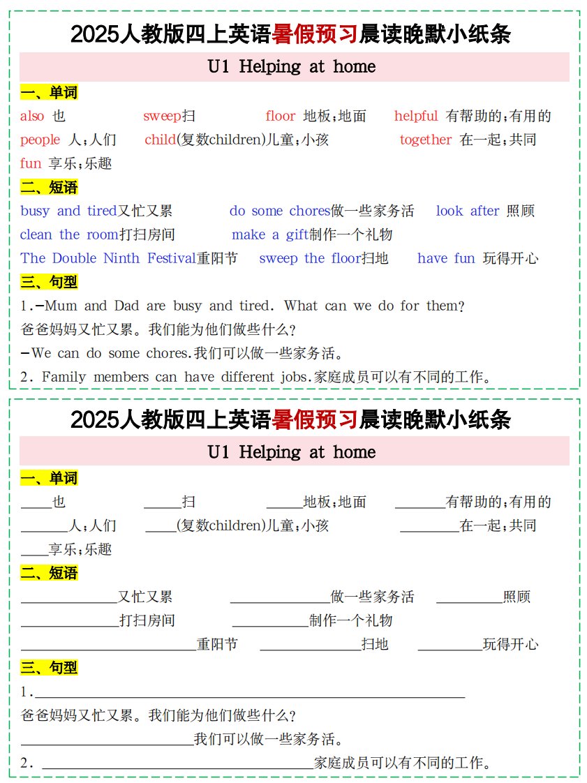 25新人教PEP四上英语暑假预习晨读晚默小纸条11天(11页)_共11页
