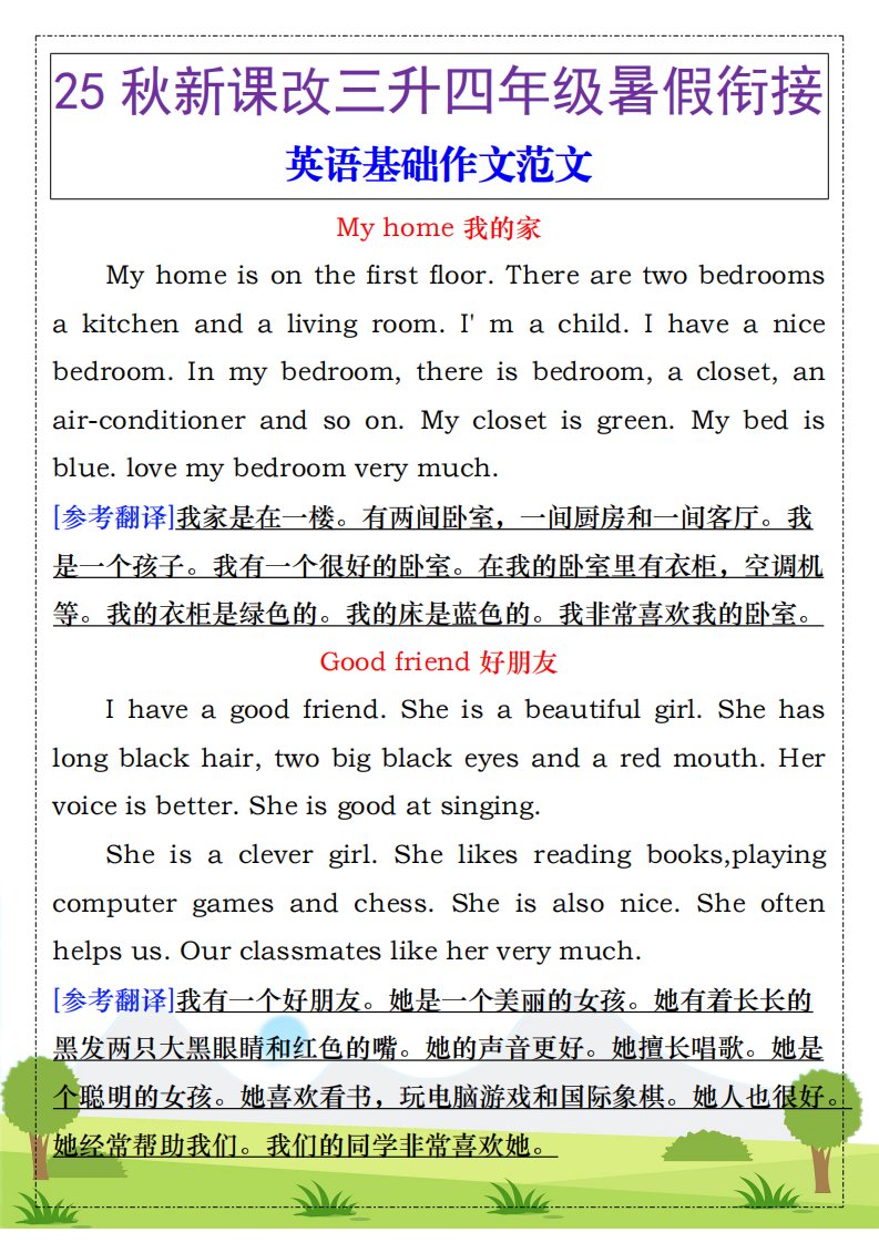 当前位置: 首页小学资源小学四年级正文 【2025秋新版】三升四年级暑假衔接,英语基础作文范文-四上英语_共2页 小学四年级 1 周前 0 0 5 以上为部分内容预览,如需源文档请登录您的会员账号进行下载! 声明:本站所有文章,如无特殊说明或标注,均为本站原创发布。任何个人或组织,在未征得本站同意时,禁止复制、盗用、采集、发布本站内容到任何网站、书籍等各类媒体平台。如若本站内容侵犯了原著者的合法权益,可联系我们进行处理。 尚学资源永久会员 打赏 收藏 海报 链接