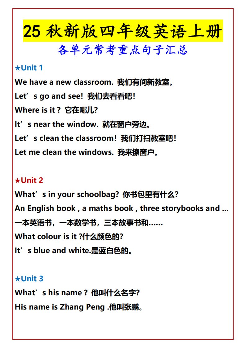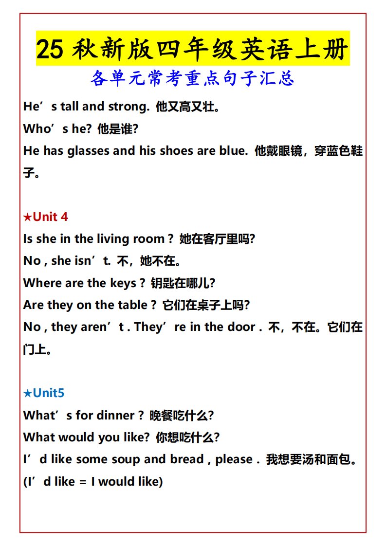 当前位置: 首页小学资源小学四年级正文 【2025秋新版】四年级英语上册各单元常考重点句子汇总_共5页 小学四年级 1 周前 0 0 5 以上为部分内容预览,如需源文档请登录您的会员账号进行下载! 声明:本站所有文章,如无特殊说明或标注,均为本站原创发布。任何个人或组织,在未征得本站同意时,禁止复制、盗用、采集、发布本站内容到任何网站、书籍等各类媒体平台。如若本站内容侵犯了原著者的合法权益,可联系我们进行处理。 尚学资源永久会员 打赏 收藏 海报 链接