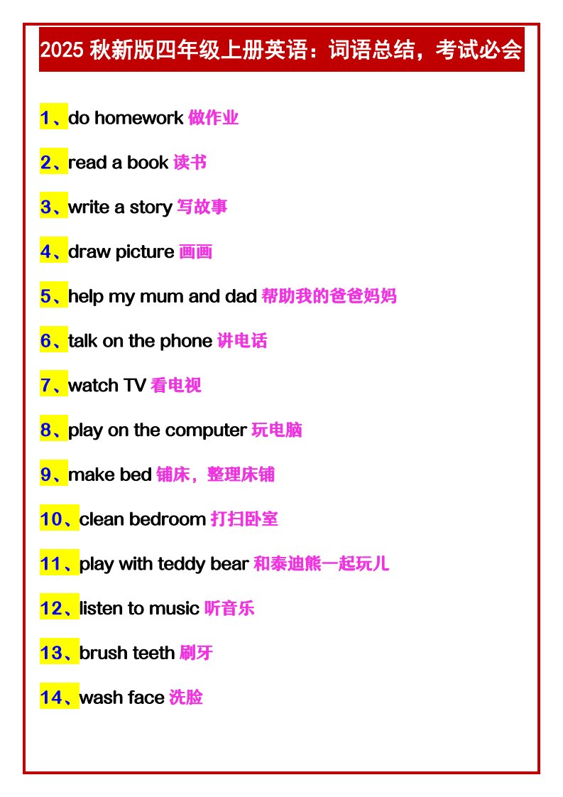 当前位置: 首页小学资源小学四年级正文 【2025秋新版】四年级上册英语:词语总结,考试必会_共2页 小学四年级 1 周前 0 0 5 以上为部分内容预览,如需源文档请登录您的会员账号进行下载! 声明:本站所有文章,如无特殊说明或标注,均为本站原创发布。任何个人或组织,在未征得本站同意时,禁止复制、盗用、采集、发布本站内容到任何网站、书籍等各类媒体平台。如若本站内容侵犯了原著者的合法权益,可联系我们进行处理。 尚学资源永久会员 打赏 收藏 海报 链接