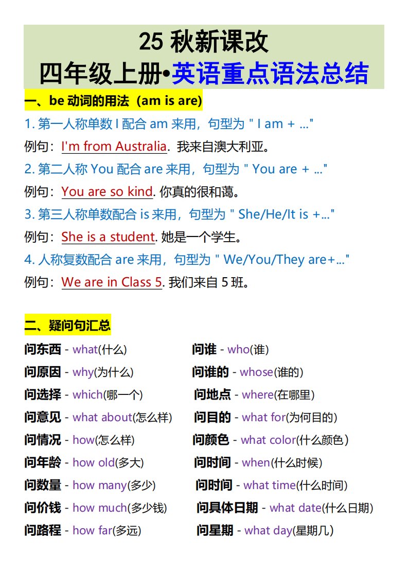 当前位置: 首页小学资源小学四年级正文 【2025秋新版】四年级上册•英语重点语法总结_共4页 小学四年级 1 周前 0 0 5 以上为部分内容预览,如需源文档请登录您的会员账号进行下载! 声明:本站所有文章,如无特殊说明或标注,均为本站原创发布。任何个人或组织,在未征得本站同意时,禁止复制、盗用、采集、发布本站内容到任何网站、书籍等各类媒体平台。如若本站内容侵犯了原著者的合法权益,可联系我们进行处理。 尚学资源永久会员 打赏 收藏 海报 链接