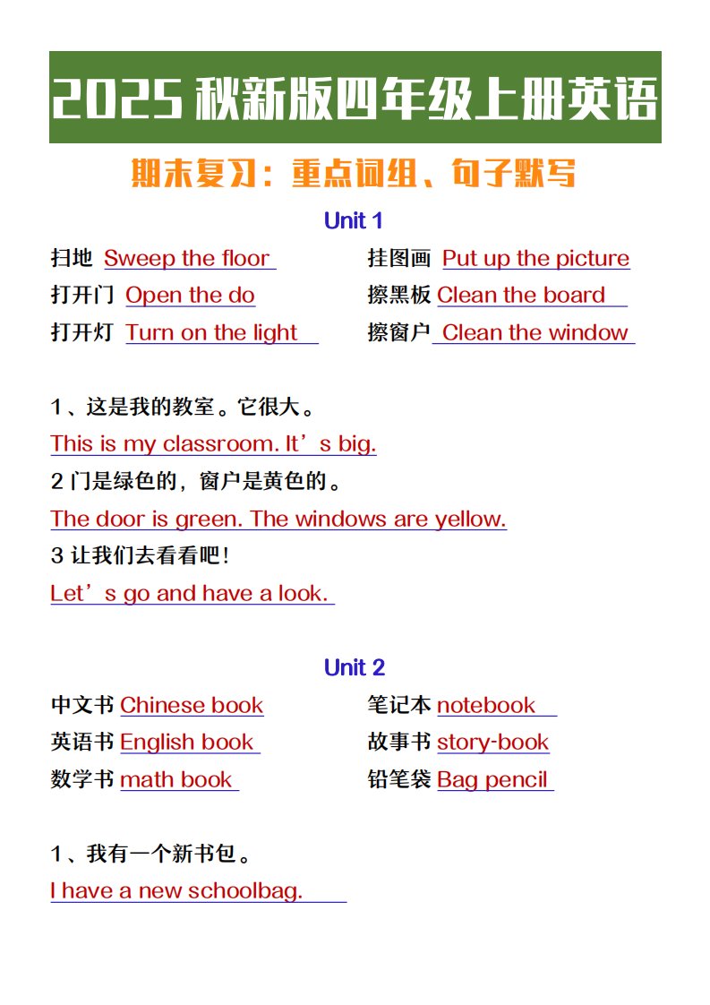 【2025秋新版】四年级上册英语期末复习必背必默短语句子_共4页