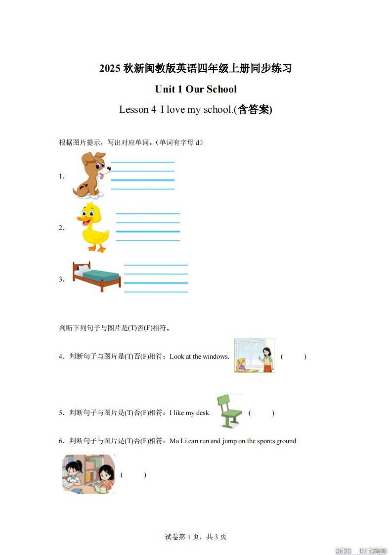 2025-2026学年闽教版(2024)英语四年级上册Unit1OurSchoolLesson4Ilovemyschool.(同步练)_共6页