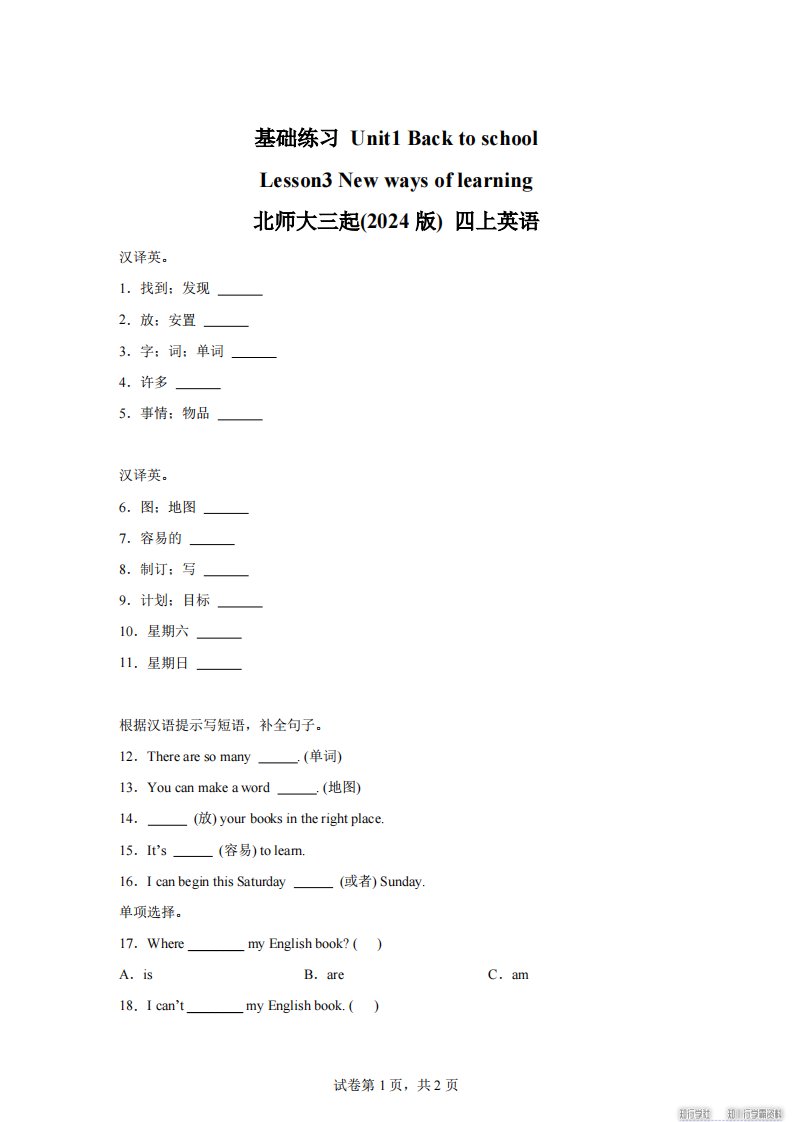 当前位置: 首页小学资源小学四年级正文 2025-2026学年北师大版(三起)(2024)英语四年级上册Unit1BacktoschoolLesson3(同步练)_共5页 小学四年级 1 周前 0 0 5 以上为部分内容预览,如需源文档请登录您的会员账号进行下载! 声明:本站所有文章,如无特殊说明或标注,均为本站原创发布。任何个人或组织,在未征得本站同意时,禁止复制、盗用、采集、发布本站内容到任何网站、书籍等各类媒体平台。如若本站内容侵犯了原著者的合法权益,可联系我们进行处理。 尚学资源永久会员 打赏 收藏 海报 链接