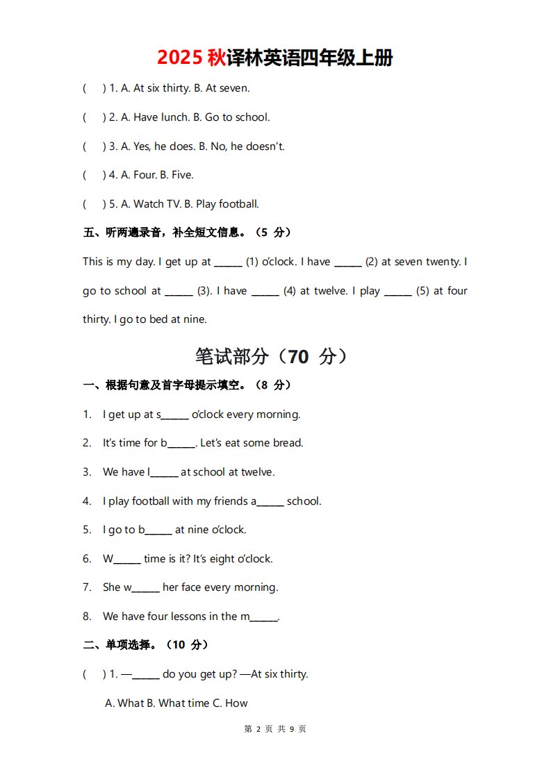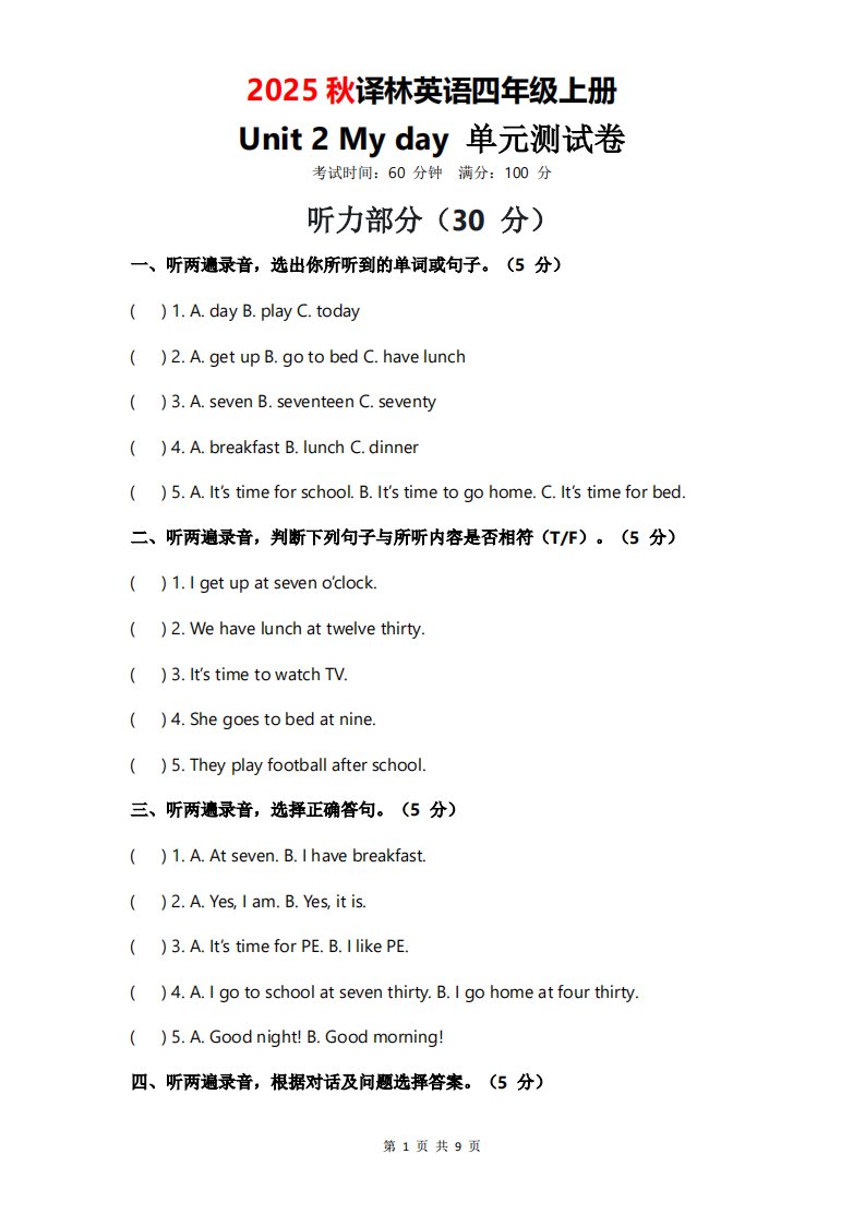 当前位置: 首页小学资源小学四年级正文 2025年秋译林版四上英语Unit2Myday单元测试卷_共9页 小学四年级 7 天前 0 0 5 以上为部分内容预览,如需源文档请登录您的会员账号进行下载! 声明:本站所有文章,如无特殊说明或标注,均为本站原创发布。任何个人或组织,在未征得本站同意时,禁止复制、盗用、采集、发布本站内容到任何网站、书籍等各类媒体平台。如若本站内容侵犯了原著者的合法权益,可联系我们进行处理。 尚学资源永久会员 打赏 收藏 海报 链接