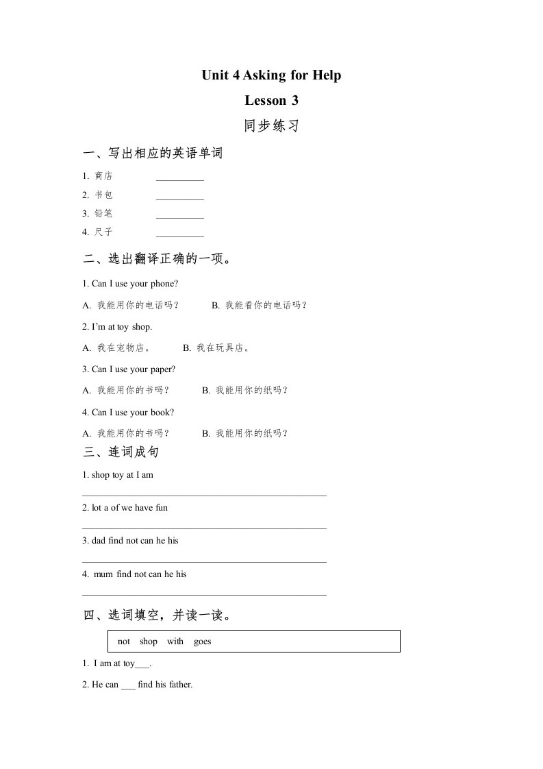 四年级英语上册Unit4AskingforHelpLesson3同步练习2(人教版一起点)_共2页