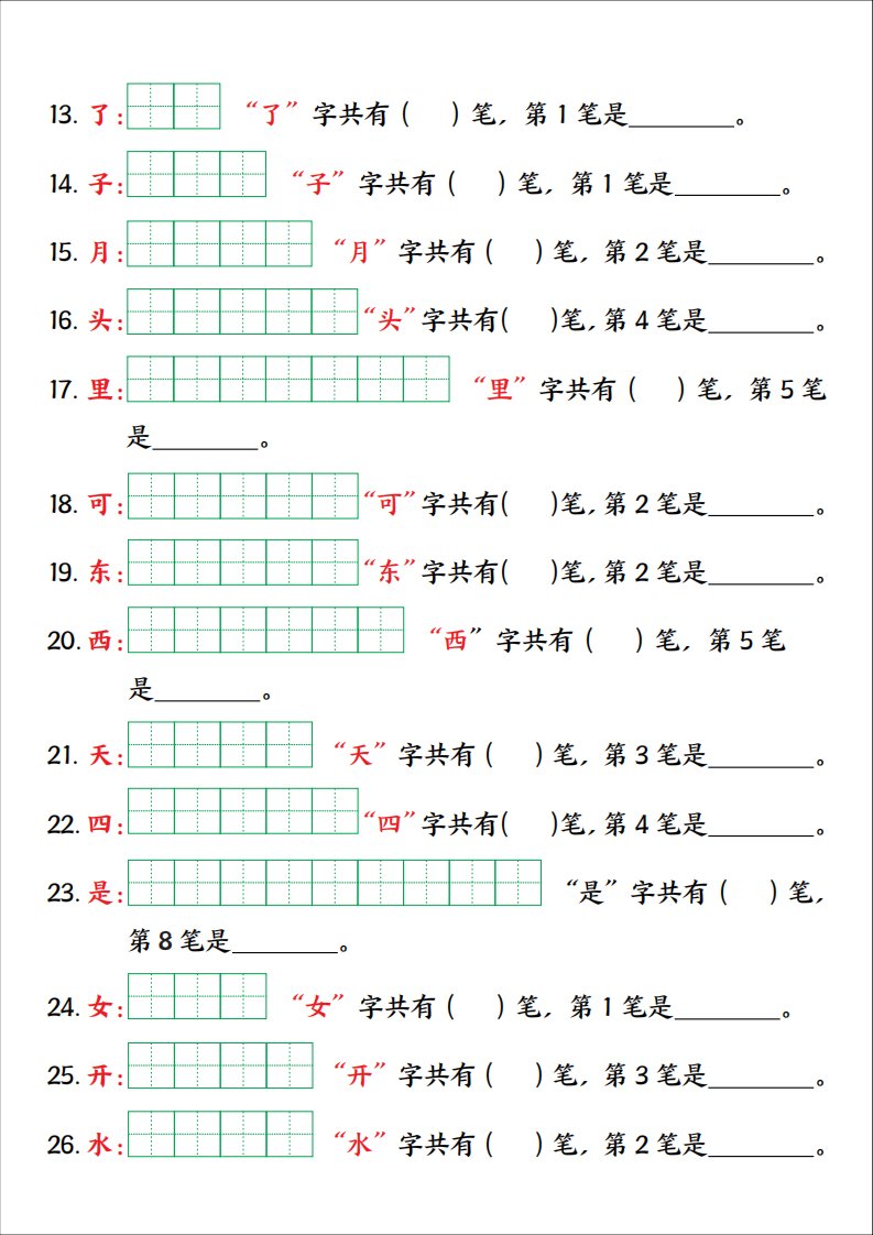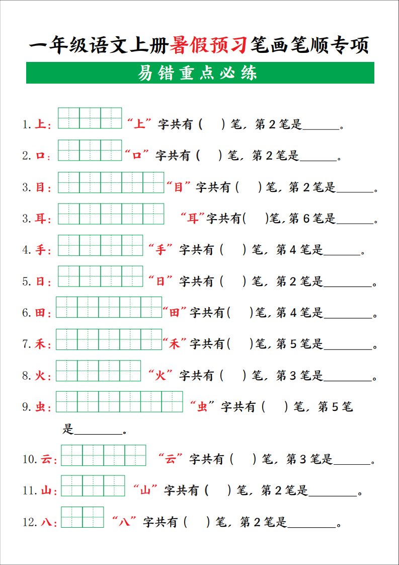 一年级语文上册暑假预习笔画笔顺专项_共7页