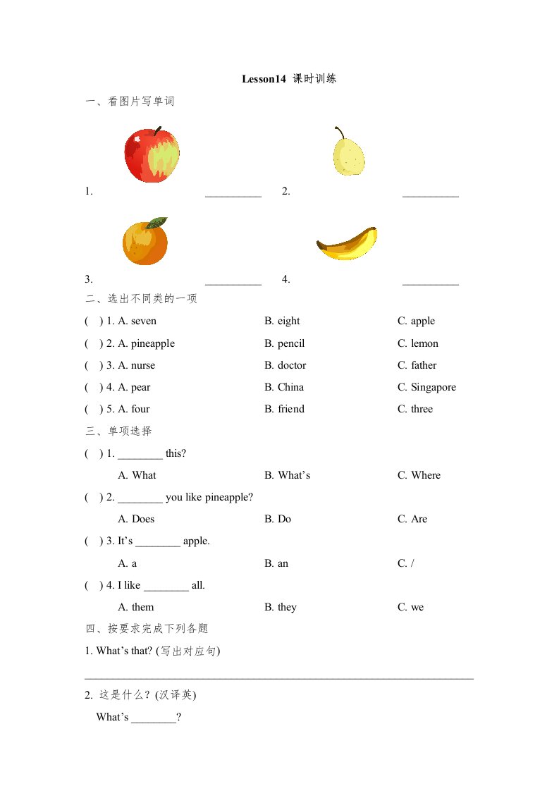 四年级英语上册Lesson14_课时训练(人教版一起点)_共3页
