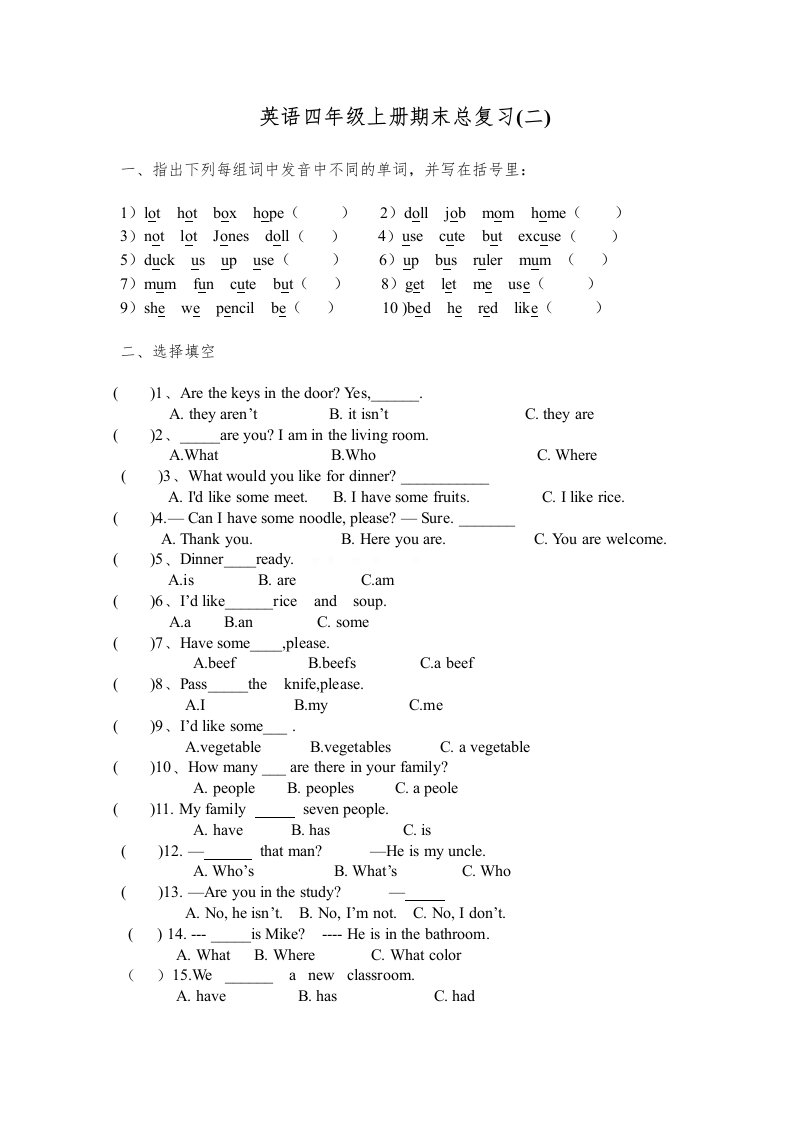 当前位置: 首页小学资源小学四年级正文 四年级英语上册PEP新版期末总复习题(2)(人教PEP)_共3页 小学四年级 1 周前 0 0 5 以上为部分内容预览,如需源文档请登录您的会员账号进行下载! 声明:本站所有文章,如无特殊说明或标注,均为本站原创发布。任何个人或组织,在未征得本站同意时,禁止复制、盗用、采集、发布本站内容到任何网站、书籍等各类媒体平台。如若本站内容侵犯了原著者的合法权益,可联系我们进行处理。 尚学资源永久会员 打赏 收藏 海报 链接