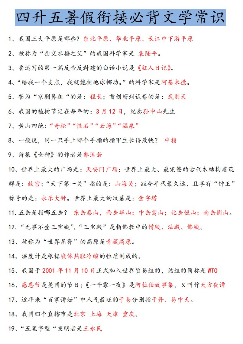 当前位置: 首页小学资源小学四年级正文 【四升五语文暑假】必背文学常识四下语文_共3页 小学四年级 1 周前 0 0 5 以上为部分内容预览,如需源文档请登录您的会员账号进行下载! 声明:本站所有文章,如无特殊说明或标注,均为本站原创发布。任何个人或组织,在未征得本站同意时,禁止复制、盗用、采集、发布本站内容到任何网站、书籍等各类媒体平台。如若本站内容侵犯了原著者的合法权益,可联系我们进行处理。 尚学资源永久会员 打赏 收藏 海报 链接