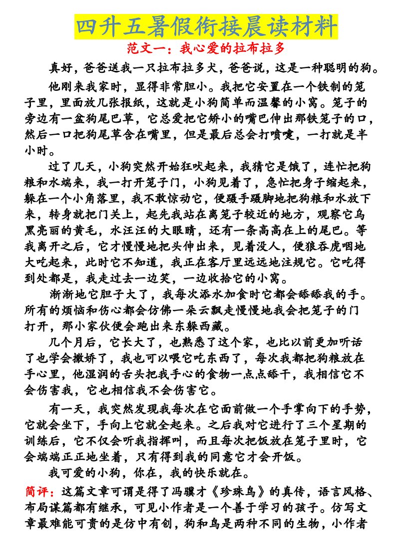 当前位置: 首页小学资源小学四年级正文 《四升五暑假衔接晨读材料》四下语文_共4页 小学四年级 1 周前 0 0 5 以上为部分内容预览,如需源文档请登录您的会员账号进行下载! 声明:本站所有文章,如无特殊说明或标注,均为本站原创发布。任何个人或组织,在未征得本站同意时,禁止复制、盗用、采集、发布本站内容到任何网站、书籍等各类媒体平台。如若本站内容侵犯了原著者的合法权益,可联系我们进行处理。 尚学资源永久会员 打赏 收藏 海报 链接