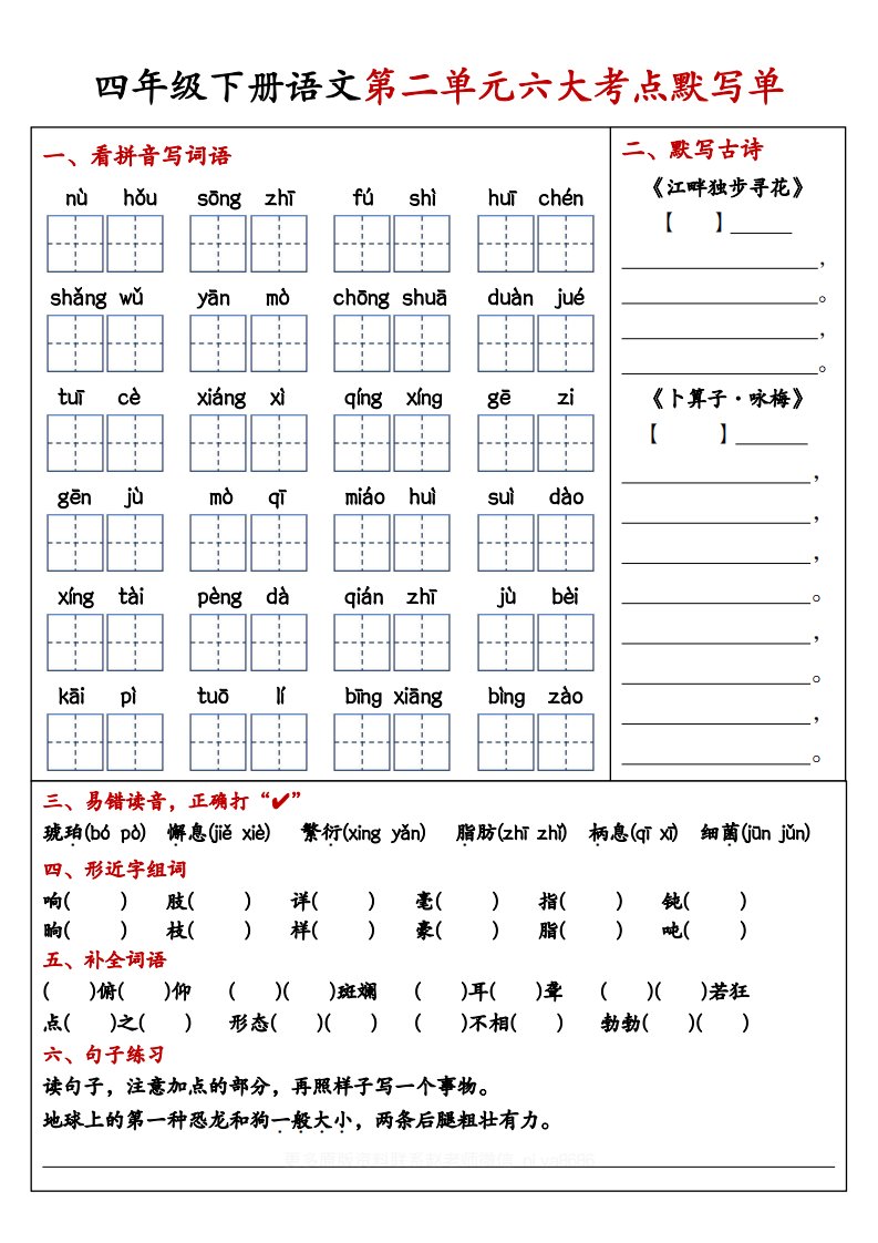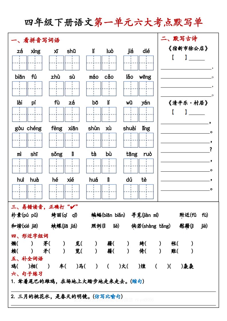 【期末复习1-8单元考点默写单-含答案】四下语文_共16页