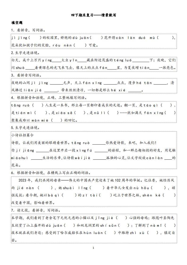 当前位置: 首页小学资源小学四年级正文 四下语文【期末专项情景默写40组】_共9页 小学四年级 1 周前 0 0 5 以上为部分内容预览,如需源文档请登录您的会员账号进行下载! 声明:本站所有文章,如无特殊说明或标注,均为本站原创发布。任何个人或组织,在未征得本站同意时,禁止复制、盗用、采集、发布本站内容到任何网站、书籍等各类媒体平台。如若本站内容侵犯了原著者的合法权益,可联系我们进行处理。 尚学资源永久会员 打赏 收藏 海报 链接
