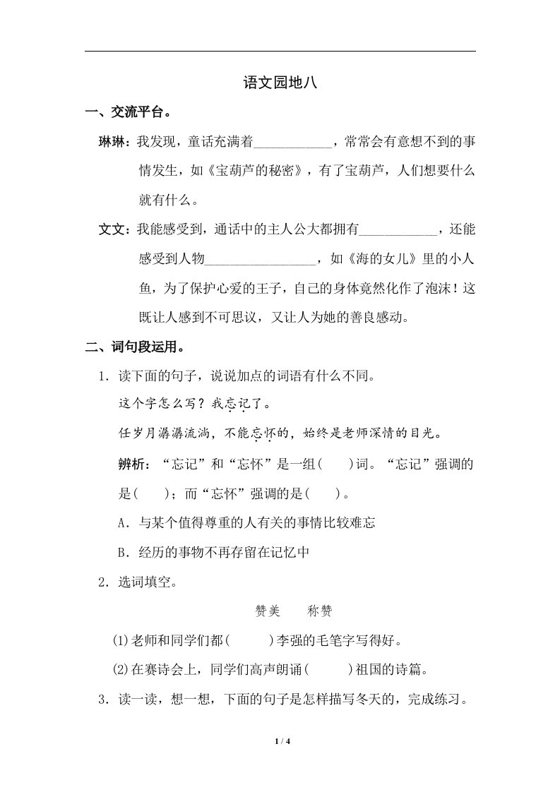 当前位置: 首页小学资源小学四年级正文 四下语文园地八:配套练习_共4页 小学四年级 1 周前 0 0 5 以上为部分内容预览,如需源文档请登录您的会员账号进行下载! 声明:本站所有文章,如无特殊说明或标注,均为本站原创发布。任何个人或组织,在未征得本站同意时,禁止复制、盗用、采集、发布本站内容到任何网站、书籍等各类媒体平台。如若本站内容侵犯了原著者的合法权益,可联系我们进行处理。 尚学资源永久会员 打赏 收藏 海报 链接