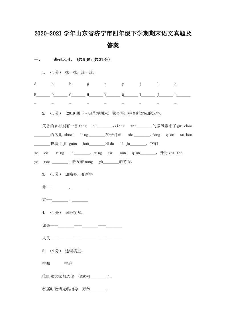 当前位置: 首页小学资源小学四年级正文 2020-2021学年山东省济宁市四年级下学期期末语文真题及答案(Word版)_共12页 小学四年级 7 天前 0 0 10 以上为部分内容预览,如需源文档请登录您的会员账号进行下载! 声明:本站所有文章,如无特殊说明或标注,均为本站原创发布。任何个人或组织,在未征得本站同意时,禁止复制、盗用、采集、发布本站内容到任何网站、书籍等各类媒体平台。如若本站内容侵犯了原著者的合法权益,可联系我们进行处理。 尚学资源永久会员 打赏 收藏 海报 链接