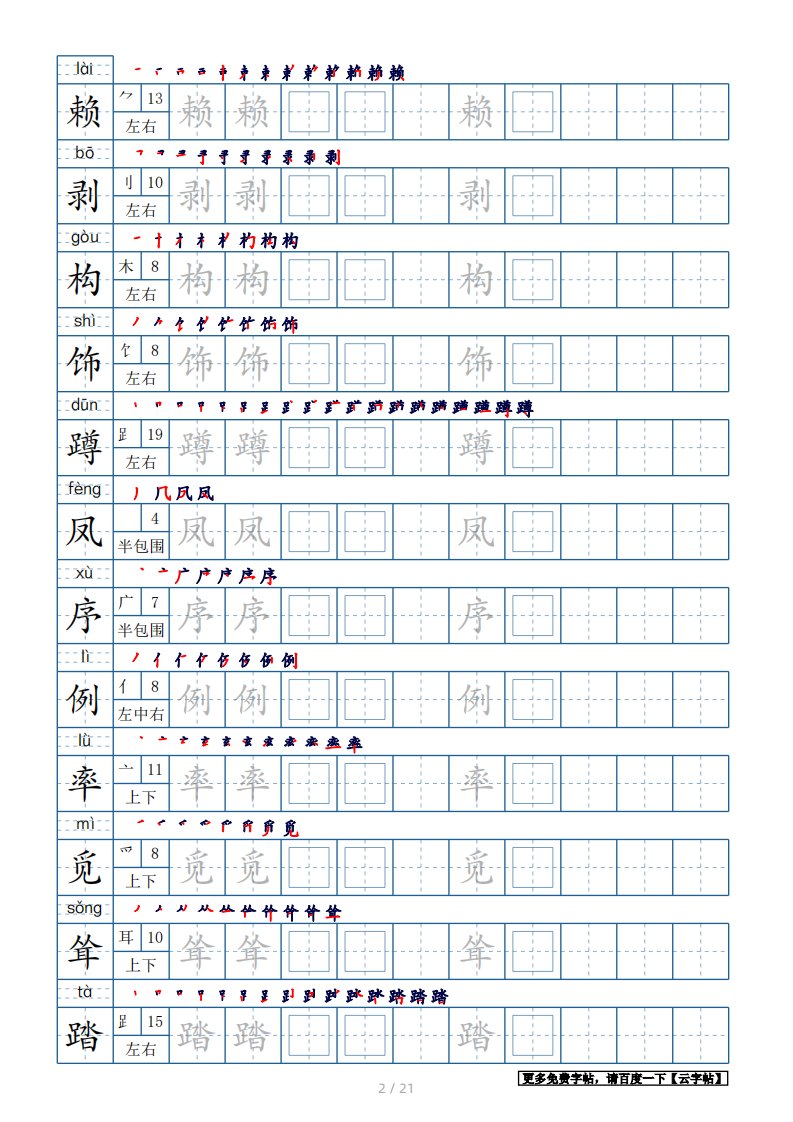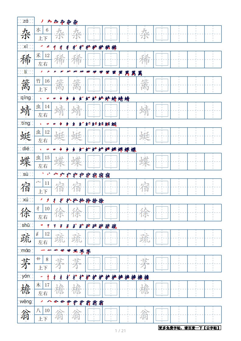 当前位置: 首页小学资源小学四年级正文 四年级语文下册生字表250个,字帖21页(带偏旁部首、笔顺,拼音)(部编版)_共21页 小学四年级 1 周前 0 0 15 以上为部分内容预览,如需源文档请登录您的会员账号进行下载! 声明:本站所有文章,如无特殊说明或标注,均为本站原创发布。任何个人或组织,在未征得本站同意时,禁止复制、盗用、采集、发布本站内容到任何网站、书籍等各类媒体平台。如若本站内容侵犯了原著者的合法权益,可联系我们进行处理。 尚学资源永久会员 打赏 收藏 海报 链接