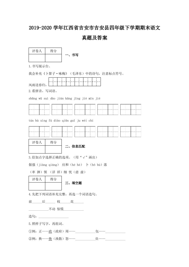 当前位置: 首页小学资源小学四年级正文 2019-2020学年江西省吉安市吉安县四年级下学期期末语文真题及答案(Word版)_共12页 小学四年级 1 周前 0 0 10 以上为部分内容预览,如需源文档请登录您的会员账号进行下载! 声明:本站所有文章,如无特殊说明或标注,均为本站原创发布。任何个人或组织,在未征得本站同意时,禁止复制、盗用、采集、发布本站内容到任何网站、书籍等各类媒体平台。如若本站内容侵犯了原著者的合法权益,可联系我们进行处理。 尚学资源永久会员 打赏 收藏 海报 链接