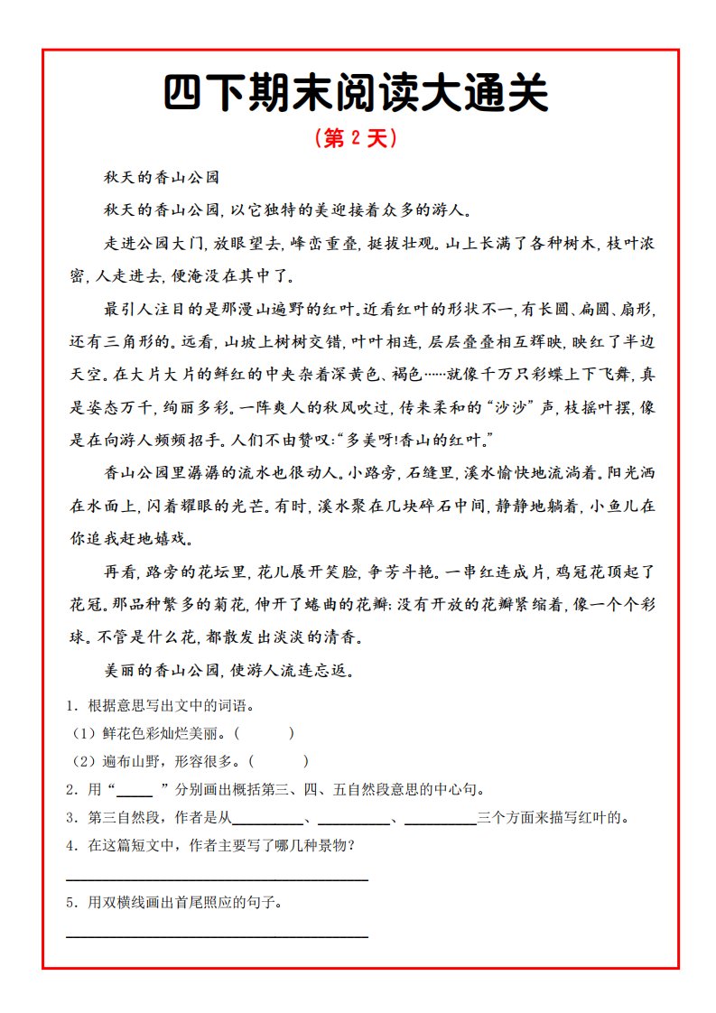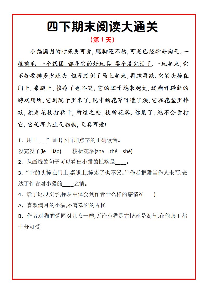四年级下册语文期末阅读通关15天_共15页