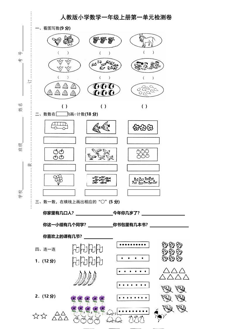 一年级数学上册第一单元《准备课》试卷(人教版)_共3页